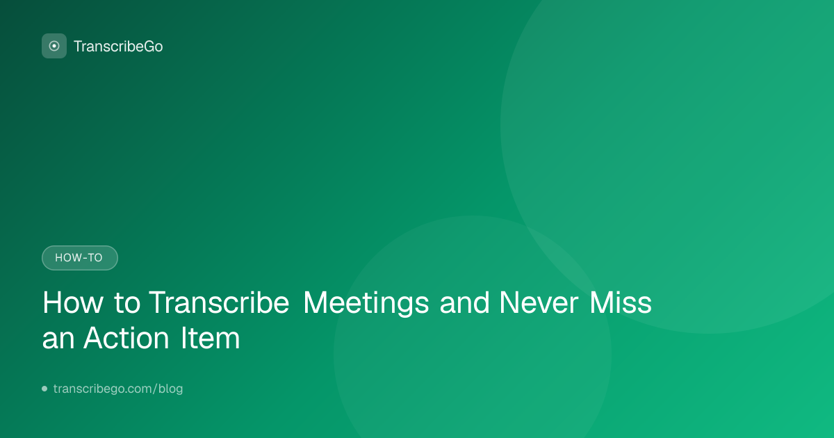 Quick answer: Record your meeting (Zoom, Google Meet, Teams, or a voice recorder), upload the audio or video file to TranscribeGo, and get a full transcript with an AI-generated summary in under a minute. From there, extract action items, share the transcript with your team, or download it as a text file. No bots joining your call, no monthly seats to pay for β just accurate transcription when you need it.
